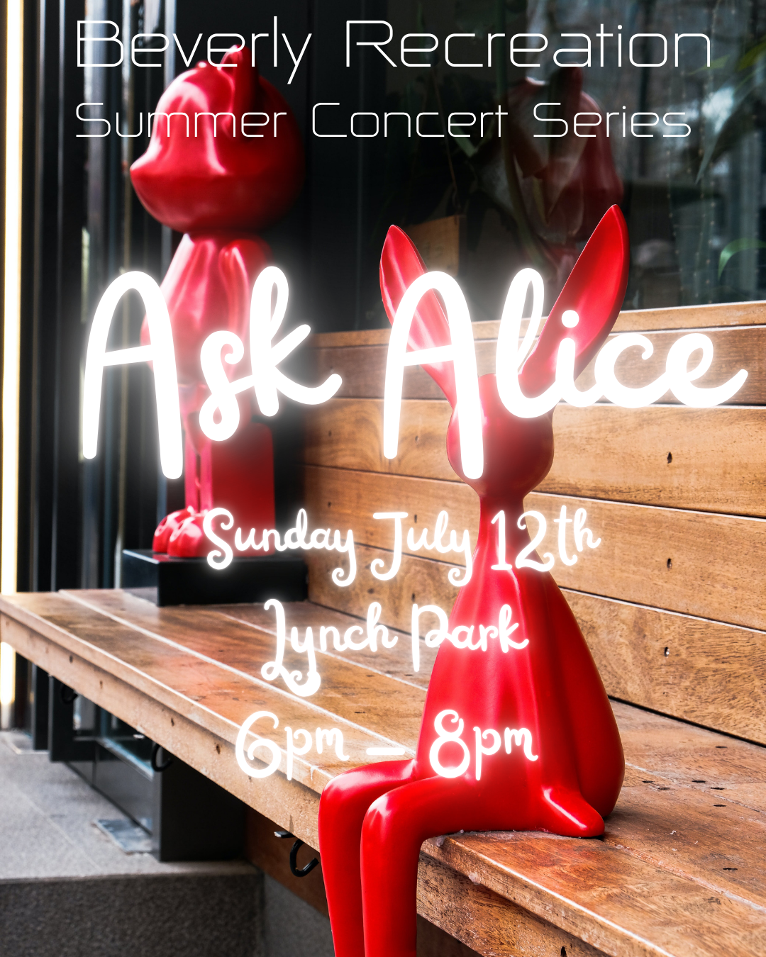 Back to All Events Summer Concert Series: Ask Alice Sunday, July 12, 2026 6:00 PM 8:00 PM Lynch Park 55 Ober Street Beverly, MA, 01915 (map) Google Calendar ICS