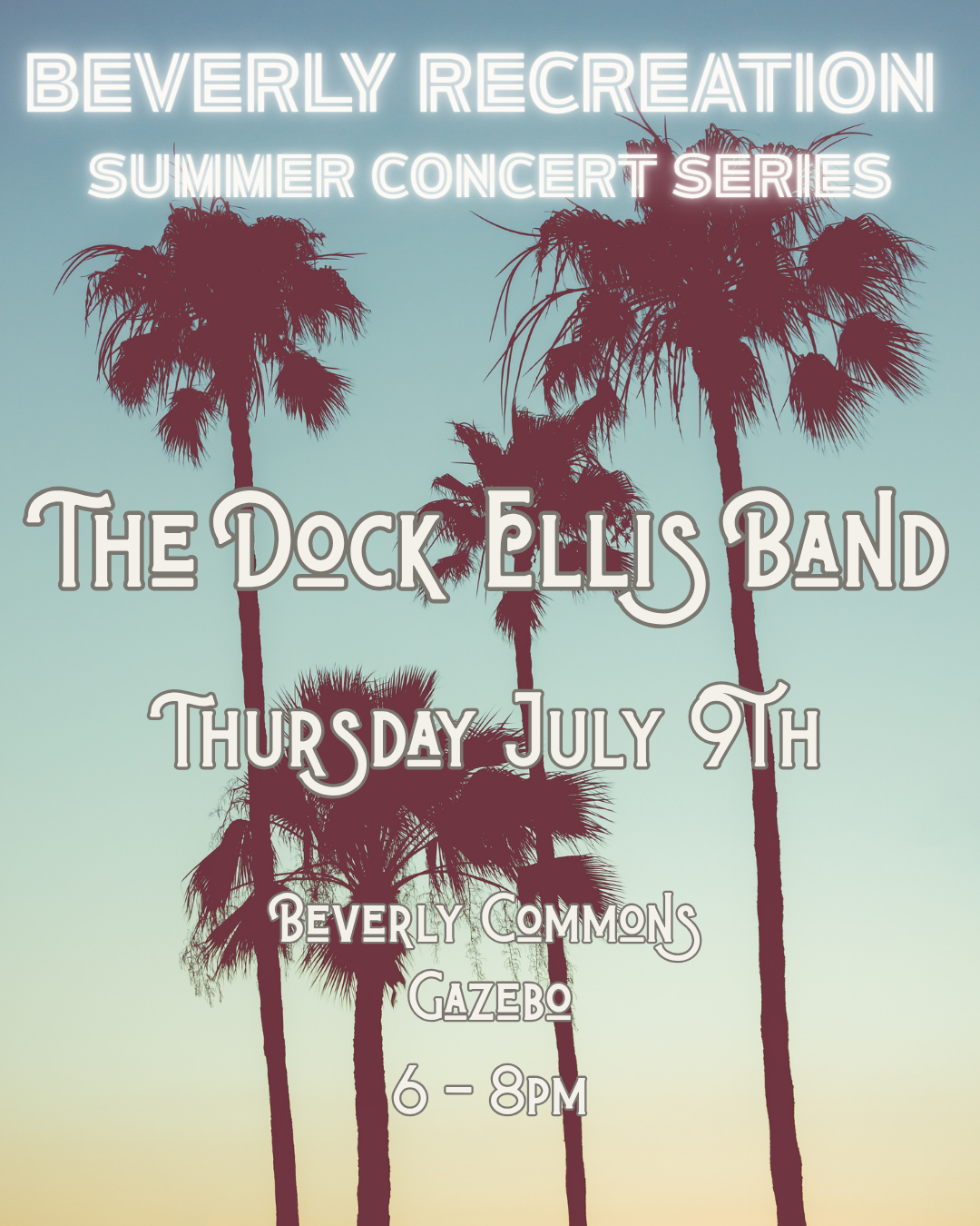 Back to All Events Summer Concert Series: The Dock Ellis Band Thursday, July 9, 2026 6:00 PM 8:00 PM Beverly Commons Gazebo 31 Dane Street Beverly, MA, 01915 (map) Google Calendar ICS