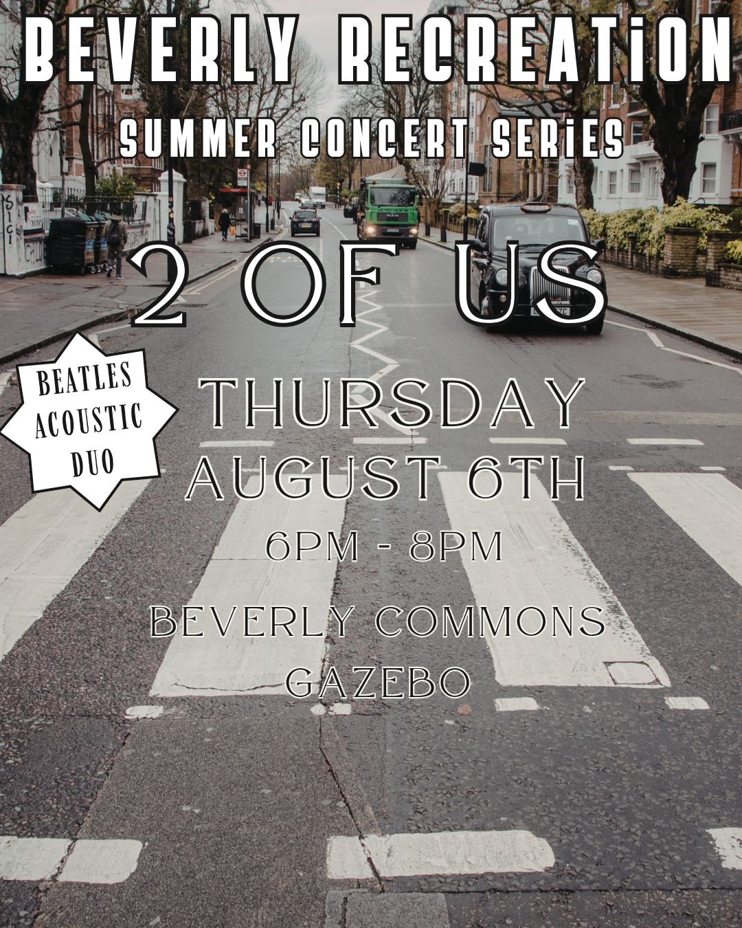 Summer Concert Series: 2 of Us Thursday, August 6, 2026 6:00 PM 8:00 PM Beverly Commons Gazebo 31 Dane Street Beverly, MA, 01915 (map) Google Calendar ICS
