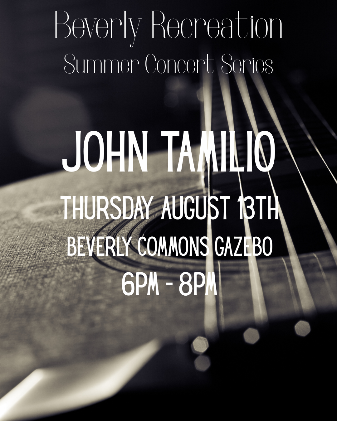 Back to All Events Summer Concert Series: John Tamilio Thursday, August 13, 2026 6:00 PM 8:00 PM Beverly Commons Gazebo 31 Dane Street Beverly, MA, 01915 (map) Google Calendar ICS