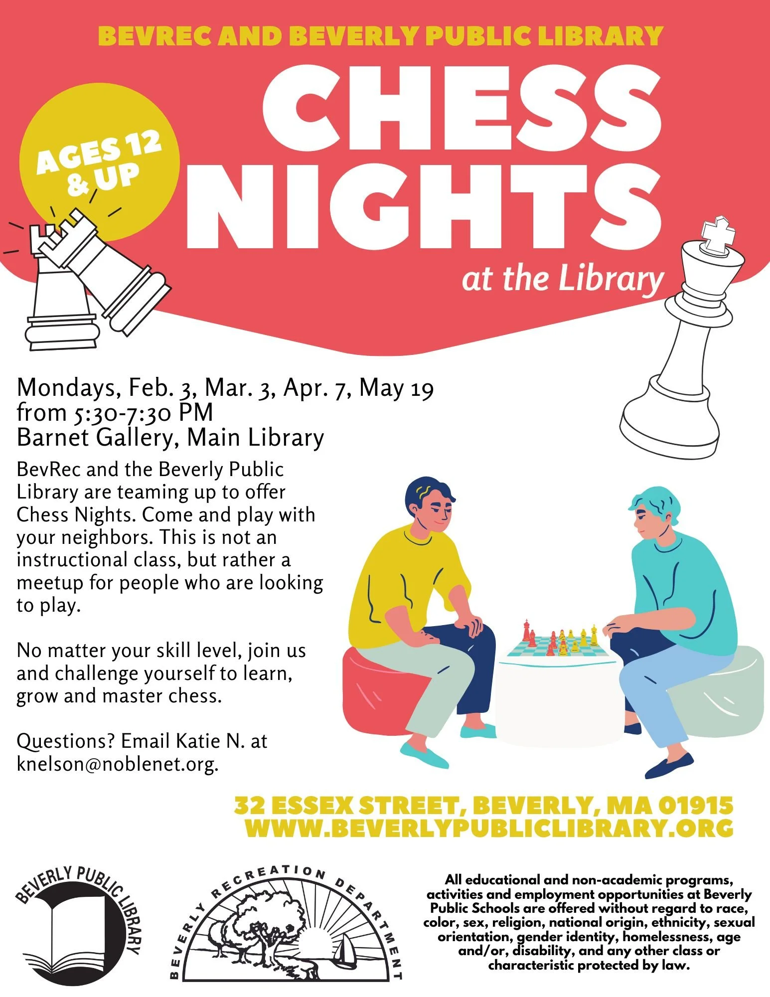 BevRec and the Beverly Public Library are teaming up to offer Chess Nights in the Barnett Gallery in the main Library at 32 Essex St, Beverly. Monthly through May, come and play the world’s greatest game (if you don’t count Pac Man) with your neighbors. This is not an instructional class, but rather a meet up for people who are looking to play.