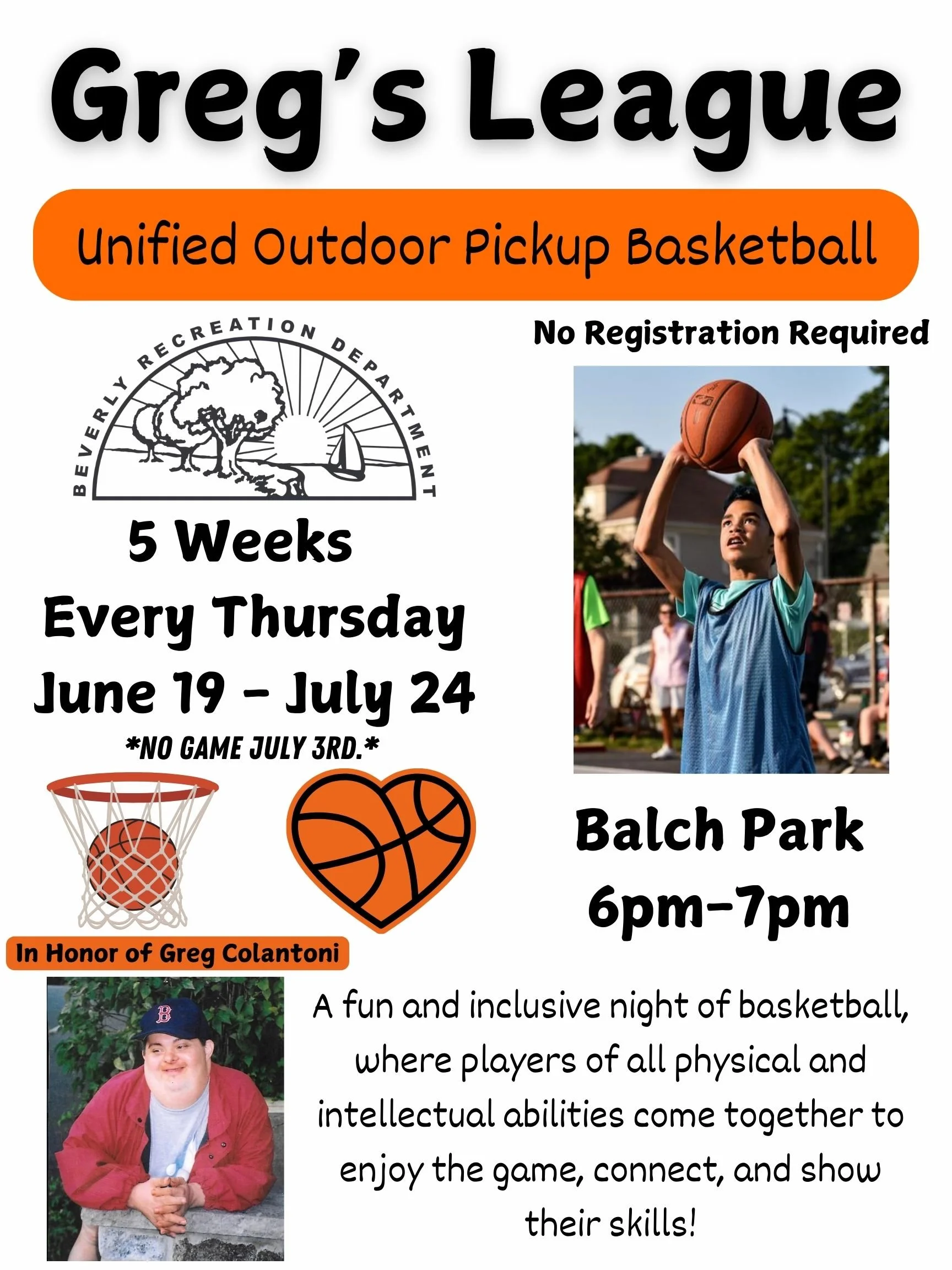 The Beverly Recreation Department is happy to announce the third season of the Unified Outdoor Pickup Basketball League, now named Greg’s League.